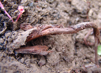 病菌在病根和土壤中越冬,第二年遇高溫高濕性氣候時(shí)發(fā)病。病菌經(jīng)工具、雨、水、害蟲傳播,皮孔、傷口入侵。主要為害根。