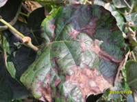 發(fā)病部位多從葉緣開始,初期在葉緣出現(xiàn)水漬狀污綠色小點(diǎn),后期病斑沿著葉緣或向內(nèi)發(fā)展,形成不規(guī)則的病斑,并且病斑逐漸變?yōu)榛野咨,病斑邊緣呈綠色。如果感染果面,則出現(xiàn)淡褐色小點(diǎn),最后呈不規(guī)則褐斑,果皮干腐,果肉腐爛。