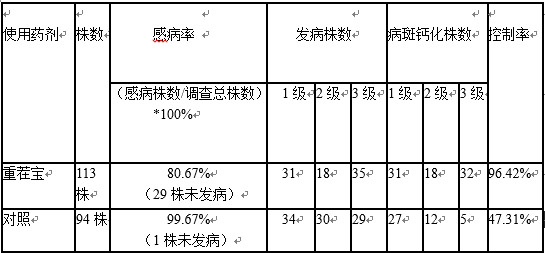 (2)用藥處理后,大多數(shù)發(fā)病株病斑已鈣化,病情發(fā)展得到控制,重茬寶300ml/畝控制率達(dá)90.77%,重茬寶200ml/畝控制率達(dá)96.87%,重茬寶100ml/畝控制率達(dá)90.48%。