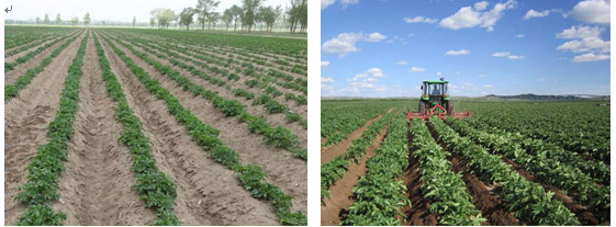 馬鈴薯培土可使植株埋入土下的節(jié)數(shù)增多,增加匍匐莖的數(shù)量,形成更多和更大的塊莖,防止干旱裂畦,塊莖見光導致薯皮發(fā)青。在苗期當株高10~15厘米左右時,結合中耕除草進行第一次適當培土,做到鋤通壟背、靠緊壟眼,除盡雜草,不傷根苗;在苗高25厘米左右時進行第二次中耕培土,培土5~7厘米;在開花前進行第三次中耕鋤草,高培土,以利于結薯。