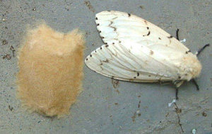 成蟲(chóng) 雌雄異型,雄體長(zhǎng)18-20mm,翅展45-47mm,暗褐色。頭黃褐色,觸角羽狀褐色,干背側(cè)灰白色。前翅外緣色深呈帶狀,余部微帶灰白,翅面上有4-5條深褐色波狀橫線;中室中央有l(wèi)黑褐圓斑,中室端橫脈上有4黑褐“<”形斑紋,外緣脈間有7-8個(gè)黑點(diǎn)。后翅色較淡,外緣色較濃成帶狀,橫脈紋色暗。雌體長(zhǎng)25-28mm,翅展70-75mm,污白微黃色。觸角黑色短羽狀,前翅上的橫線與斑紋同雄相似,為暗褐色;后翅近外緣有1條褐色波狀橫線;外緣脈間有7個(gè)暗褐色點(diǎn)。腹部肥大,末端密生黃褐色鱗毛。