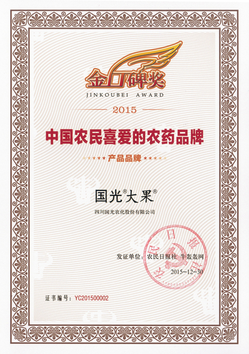 “2015中國農(nóng)民喜愛的農(nóng)藥品牌”大型公益調(diào)查活動(dòng)在2015年10月22日啟動(dòng),通過農(nóng)民日?qǐng)?bào)等機(jī)構(gòu)調(diào)查,國光“大果”榮獲2015中國農(nóng)民喜愛的農(nóng)藥品牌稱號(hào)。