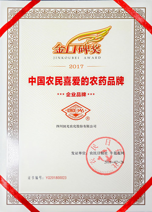 國(guó)光榮獲“2017金口碑獎(jiǎng)”,該獎(jiǎng)代表農(nóng)民對(duì)農(nóng)藥品牌的喜愛(ài)和真實(shí)的評(píng)價(jià),是目前中國(guó)農(nóng)藥行業(yè)有影響力的大獎(jiǎng)之一。
