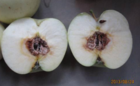 只危害果實(shí)。分為霉心型和心腐型。初期心室組織變褐壞死,后向外擴(kuò)展,果肉變褐色或者深褐色,味苦,可從果柄洼出爛透。心室內(nèi)充滿白色、黑褐色、青綠色或者粉紅色霉層,以粉紅色霉層最常見。幼果發(fā)病,內(nèi)外常包敷紅粉。北斗、元帥系品種的病果易脫落,青香蕉的病幼果多在樹上變黃,國(guó)光則干縮成黑色小僵果,掛在樹上經(jīng)冬不落。