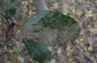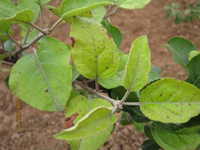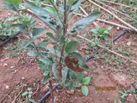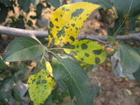 不同蘋果品種的感病性有明顯差異。高溫多雨,當(dāng)氣溫在10-20℃,光照較強(qiáng),癥狀較重。樹勢(shì)衰弱時(shí),癥狀較重,幼樹比成株易發(fā)病。土壤干旱,水肥不足時(shí)發(fā)病重。