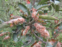 主要為害葉片,也能為害嫩枝、幼果和果柄 。葉片初患病正面出現(xiàn)油亮的橘紅色小斑點(diǎn),逐漸擴(kuò)大,形成圓形橙黃色的病斑,邊緣紅色。發(fā)病嚴(yán)重時(shí),一張葉片出現(xiàn)幾十個(gè)病斑。發(fā)病1~2周后,病斑表面密生鮮黃色細(xì)小點(diǎn)粒,初為桔黃色,后變?yōu)楹谏。病斑背面隆起,叢生淺黃色毛狀物。果實(shí)受害,初生黃色小點(diǎn),后變褐色,病斑四周有與葉背相同的毛狀物。