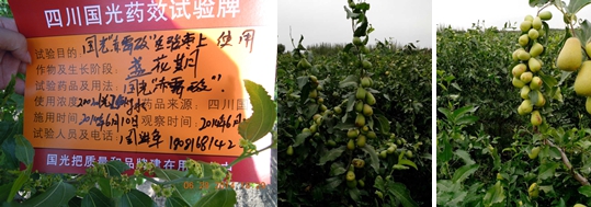 2014年6月,新疆阿克蘇農(nóng)一師兵團(tuán)棉麻站,陸地灰棗園,在灰棗盛花期使用國(guó)光3%赤霉酸2000倍+國(guó)光硼2000倍+國(guó)光優(yōu)豐2000倍,全株噴施2次(間隔7天使用一次)。用藥后棗果脫盤率高,脫盤快,平均棗吊坐果率15個(gè)。