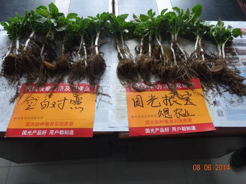 當(dāng)時將馬鈴薯根系取下并測量根系的數(shù)量,可以明顯發(fā)現(xiàn)使用國光根寶的根系數(shù)量大且比對照長,根系比較發(fā)達(dá)。而對照的根系比較短、少。