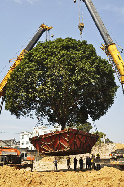 20名作業(yè)人員,連續(xù)一周的緊張工作,40余萬(wàn)元搬家費(fèi)用。2014年10月23日上午12時(shí)10分,在兩臺(tái)大型起重機(jī)巨臂的牽引下,總重達(dá)62噸的“桂花王”連同底部的箱梁緩緩落入預(yù)定的坑穴,岳西縣城居民廣泛關(guān)注的“桂花王”順利移動(dòng)60余米,成功入住新家。