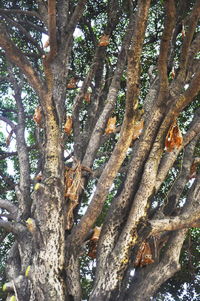 從10月15日開(kāi)始開(kāi)挖,到今天成功搬家,再到下一步的“生根發(fā)芽”,如何確保這棵桂花王順利適應(yīng)新環(huán)境?來(lái)自四川農(nóng)大的碩士王天龍介紹,從15日開(kāi)始,技術(shù)人員定期往樹(shù)葉上噴灑抑制蒸騰劑,以減少水分蒸發(fā)。同時(shí)使用營(yíng)業(yè)液為枝干補(bǔ)充能量!澳壳拔覀兪褂玫臓I(yíng)養(yǎng)液已經(jīng)超過(guò)300公斤,你看樹(shù)干上一袋袋,掛的都是營(yíng)養(yǎng)液!蓖跆忑埿χf(shuō)。
