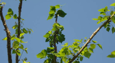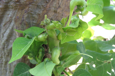 刺桐姬小蜂專一危害刺桐屬植物,該蟲生殖能力很強(qiáng),通常一旦出現(xiàn)輕微感染,短時(shí)間內(nèi)便會(huì)擴(kuò)散到全株。刺桐姬小蜂將卵產(chǎn)于刺桐嫩葉和葉柄組織內(nèi), 幼蟲在植物組織內(nèi)生長(zhǎng)發(fā)育。由于植物組織受到幼蟲唾液分泌物刺激而增生, 呈水泡狀膨大, 并在葉片背面和葉柄上形成瘤狀蟲癭。蟲癭很快蔓延到全株, 致使全株葉片組織膨大,發(fā)展形成畸形、卷曲的病葉,嚴(yán)重影響整體景觀效映。幼蟲在蟲癭內(nèi)化蛹, 羽化的成蟲從蟲癭的羽化孔飛出。姬小蜂除了造成蟲癭, 使枝葉膨大、扭曲變形, 降低刺桐的觀賞價(jià)值外, 還會(huì)使形成蟲癭的枝、葉和旁邊的嫩枝、嫩芽枯死,葉片脫落。新發(fā)的葉片、嫩枝不斷受到感染, 無(wú)法長(zhǎng)出健康的枝葉進(jìn)行光合作用,到后期直接造成刺桐樹死亡。