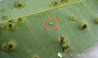 圖2.從“包狀物”內剝離出的木虱幼蟲(圓圈內) 圖3.木虱成蟲(圓圈內),黑色小孔為羽化孔